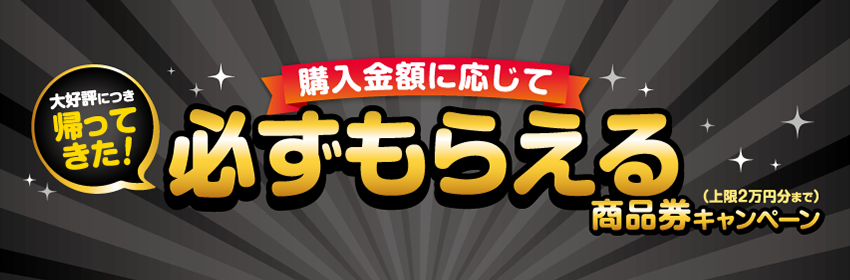 ※何回でもご応募いただけますが、お一人あたりキャンペーン期間中の合計購入金額100,000円(商品券20,000円分)が上限となります。