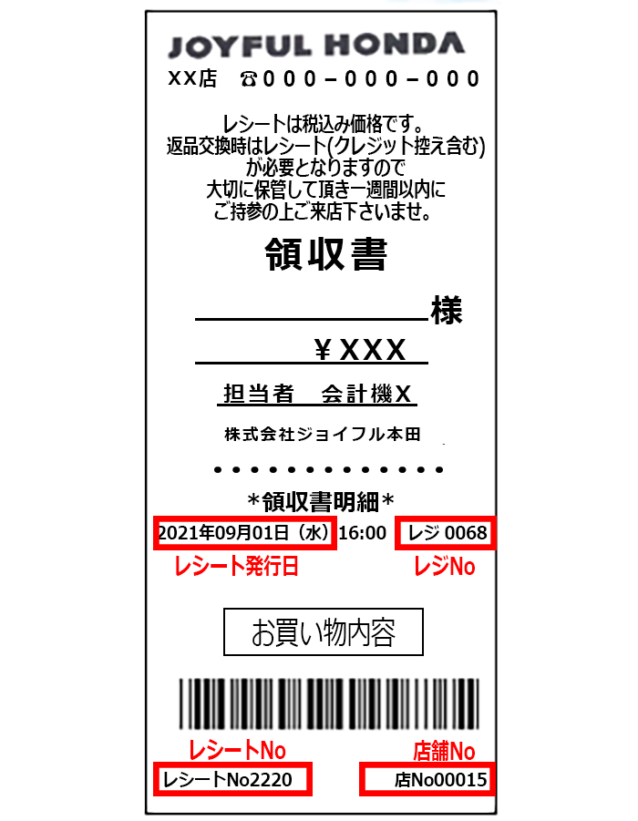 ※購入店舗、購入日時、合計金額、購入商品名、購入商品単価、購入商品個数、レジNo.、レシートNo.、店舗No.のいずれか一つでも判読できない場合